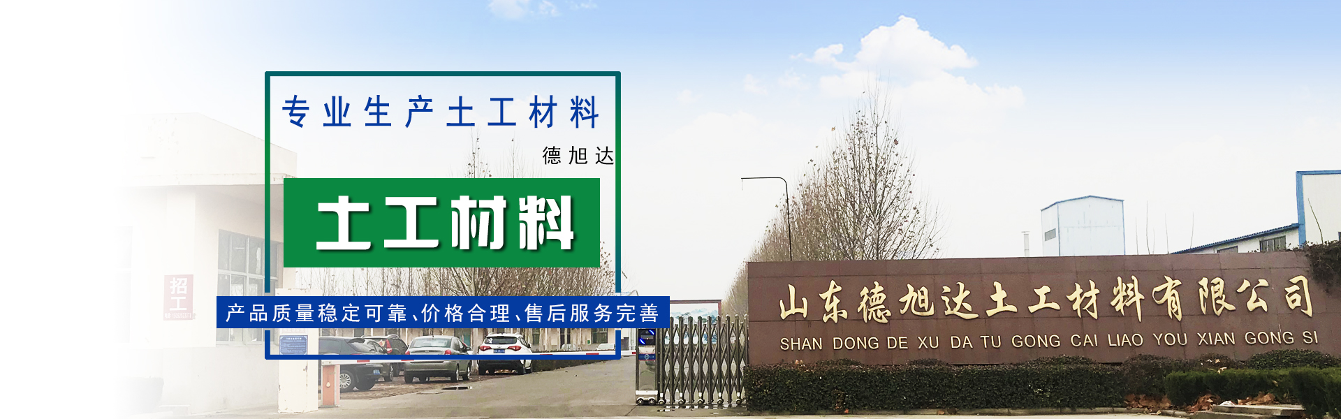 山東德旭達(dá)土工材料有限公司是目前規(guī)模較大,品種較全的土工合成材料專業(yè)生產(chǎn)企業(yè),是全國土工合成材料生產(chǎn)基地重點企業(yè)之一,注冊資本為5070萬元,占地面積120畝,現(xiàn)有員工100余人,其中各類專業(yè)技術(shù)人員40多人。 地理位置優(yōu)越,交通十分便捷。山東德旭達(dá)土工材料有限公司位于西漢大文學(xué)家東方朔故里,魯西北著名歷史名城—德州 市陵城經(jīng)濟(jì)開發(fā)區(qū)。京滬高速鐵路依縣而過,京福高速公路、德煙鐵路、京滬鐵...【了解更多】